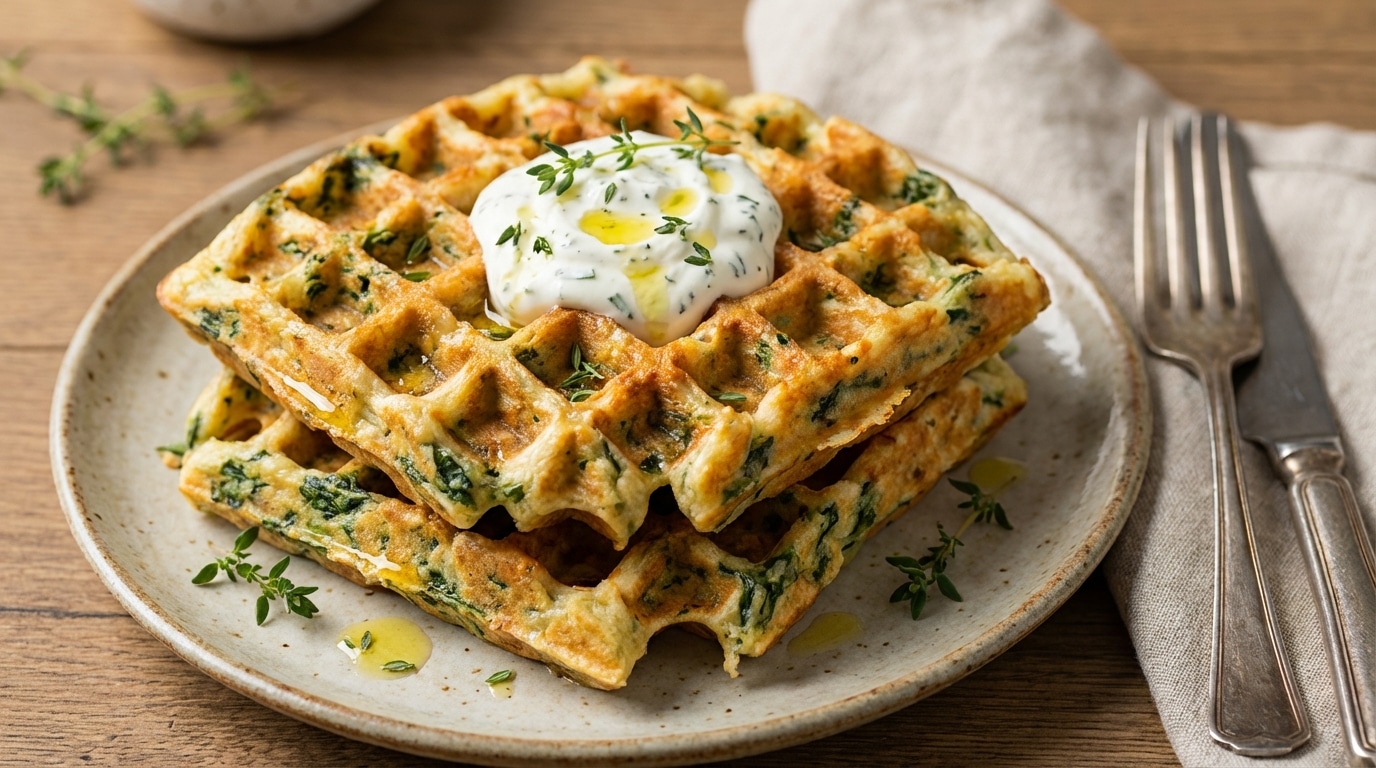 Pour les appétits les plus gourmands ou pour transformer ce dîner facile en un brunch dominical sophistiqué, les garnitures peuvent se faire plus généreuses. Un œuf mollet ou au plat, déposé délicatement sur le dessus, permet au jaune coulant onctueux de napper la gaufre et de s’infiltrer dans ses alvéoles, agissant comme une sauce naturelle et riche. Quelques tranches de saumon fumé ou de truite des Pyrénées, accompagnées d’une cuillère de crème fraîche épaisse aux herbes (ciboulette ou aneth), apporteront une touche iodée et élégante qui complète à merveille la saveur terrienne et douce de l’épinard.