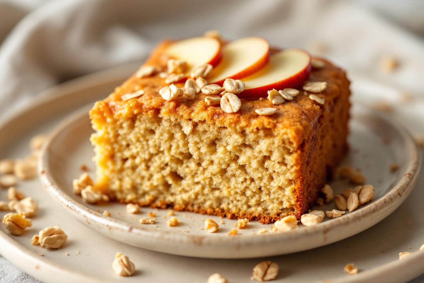 Toujours aussi pratique : le gâteau se conserve sans problème deux jours à température ambiante, sous cloche ou dans une boîte hermétique. Pour une texture toujours aussi tendre, il suffit de glisser la part souhaitée quelques secondes au micro-ondes : le parfum de la pomme et de l’avoine se réveille instantanément. Il accompagnera à merveille un thé fumant, un chocolat chaud, ou une grande infusion épicée, pour prolonger cette parenthèse hivernale pleine de douceur.