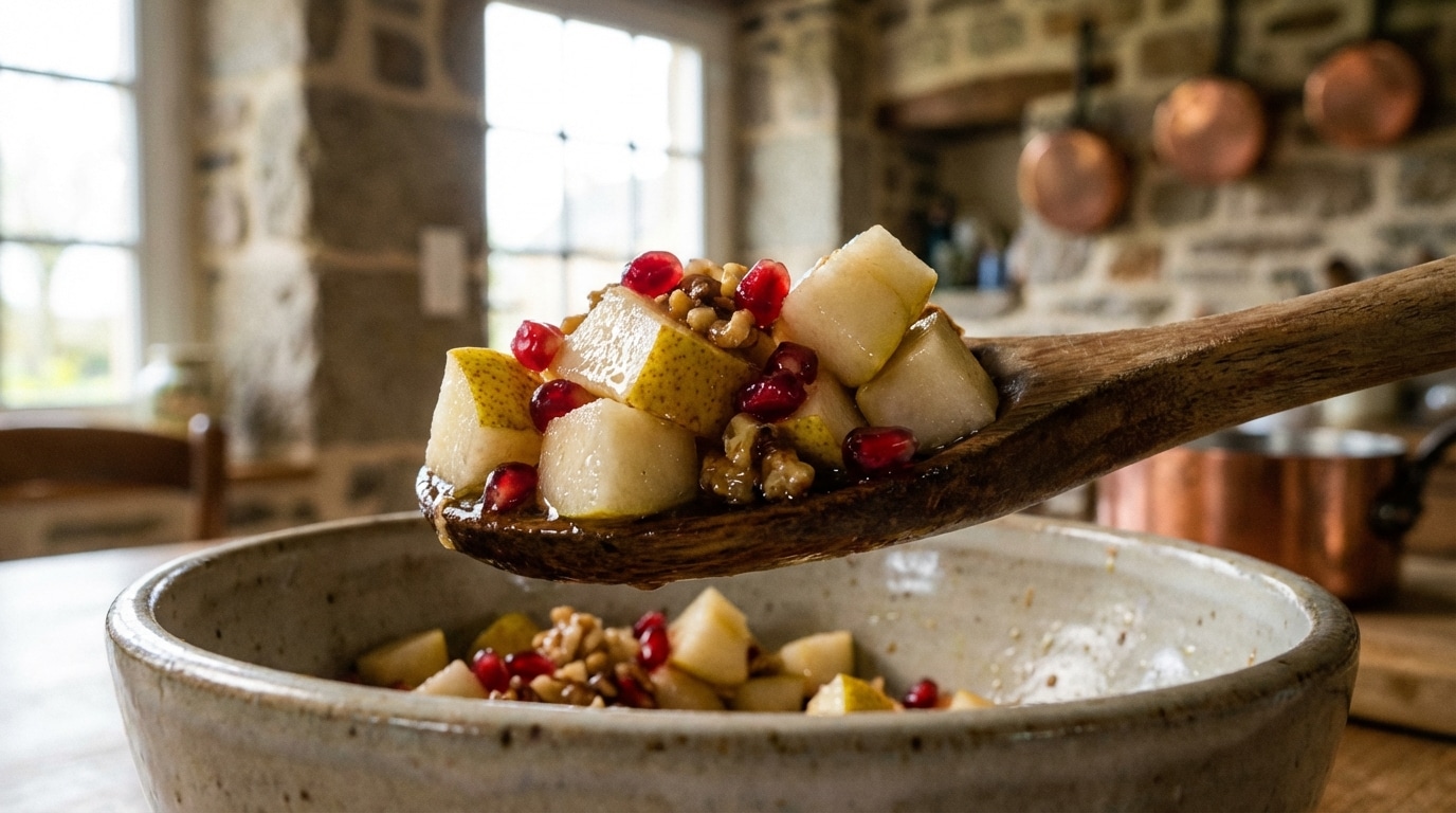 Cette salade de poires à l’huile de noix apportera douceur et fraîcheur à vos papilles. Agrémentée de noix et graines de grenade, on la déguste avec une sauce citronnée à l’huile de noix. Cette recette est originale et vous permettra de déguster les poires autrement !