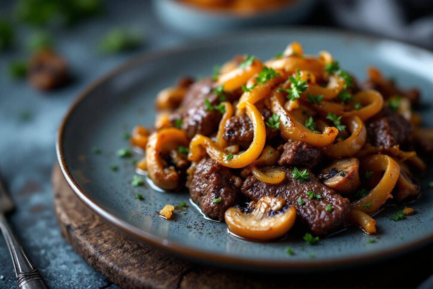 La présentation a toute son importance : disposer le bœuf sauté aux oignons et champignons dans un grand plat familial, saupoudrer de persil et servir immédiatement afin de préserver la saveur intense et la texture juteuse du plat. Sur une assiette plus raffinée, ajouter quelques copeaux de parmesan ou une pointe de piment d’Espelette pour les amateurs de sensations fortes.