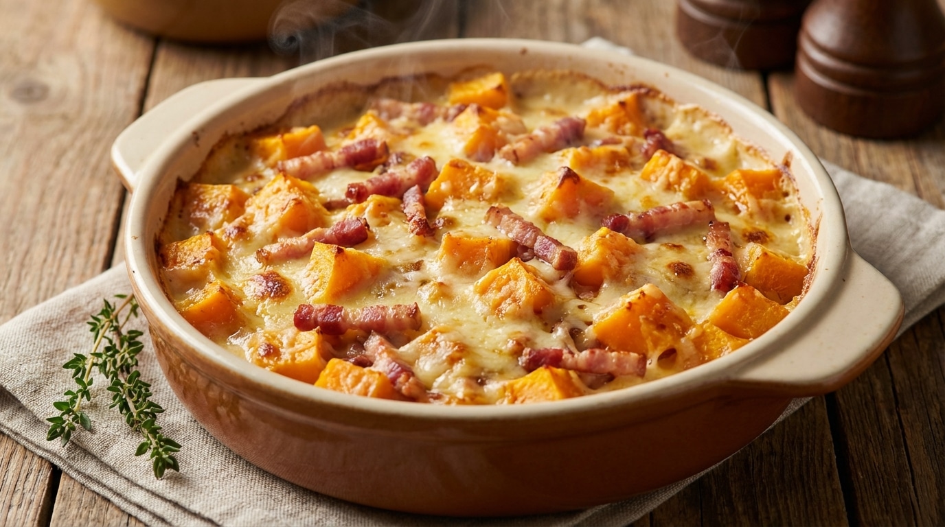 Lorsque le vent glacial de janvier souffle contre les vitres et que la nuit tombe dès la fin de l’après-midi, l’envie de se réfugier dans la cuisine se fait impérieusement sentir. C’est le moment idéal pour miser sur des plats qui embaument la maison de notes réconfortantes et transforment l’atmosphère en un cocon chaleureux. L’hiver invite à la gourmandise décomplexée, où les légumes racines rencontrent la richesse des laitages fondants pour créer des souvenirs gustatifs mémorables. Inutile de passer des heures aux fourneaux pour obtenir un résultat digne d’une grande tablée : la magie opère souvent grâce à l’association d’ingrédients bruts et généreux. Ce gratin, véritable hymne à la saison froide, promet un équilibre parfait entre la douceur sucrée de la courge et le caractère fumé de la charcuterie, le tout lié par une texture onctueuse qui ravira les palais les plus exigeants en quête de chaleur et de simplicité.