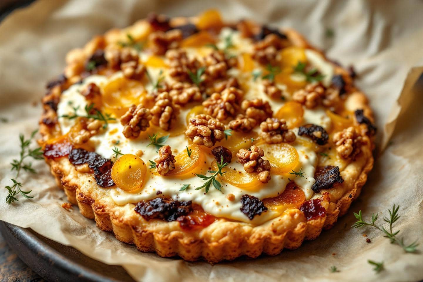 L’hiver déploie ses nuits longues et ses petits matins givrés, et la cuisine s’habille de parfums réconfortants. Au cœur de la saison, une tarte rustique s’invite à table : généreuse, dorée, sans chichi ni moule, elle marie le fondant du poireau doucement compoté, la douceur lactée du chèvre frais et l’exubérance croquante des noix torréfiées. Ce trio livre un pur bonheur de saveurs à partager lors d’un dîner improvisé, entre amis, ou au chaud, sous un plaid, quand dehors Paris, Lyon ou Lille brillent des dernières illuminations de fin d’année. Rien n’égale la simplicité d’une pâte maison que l’on étale du bout des doigts, ni l’alliance parfumée de légumes et fromage de saison, juste relevés d’une pointe de miel. Oublier le moule, retrouver la liberté du geste et se rappeler que la générosité réside avant tout dans la simplicité. Goûter, savourer, se régaler : voilà tout ce que promet cette tarte rustique, prête à faire pétiller les soirs de décembre et les lendemains de réveillon.