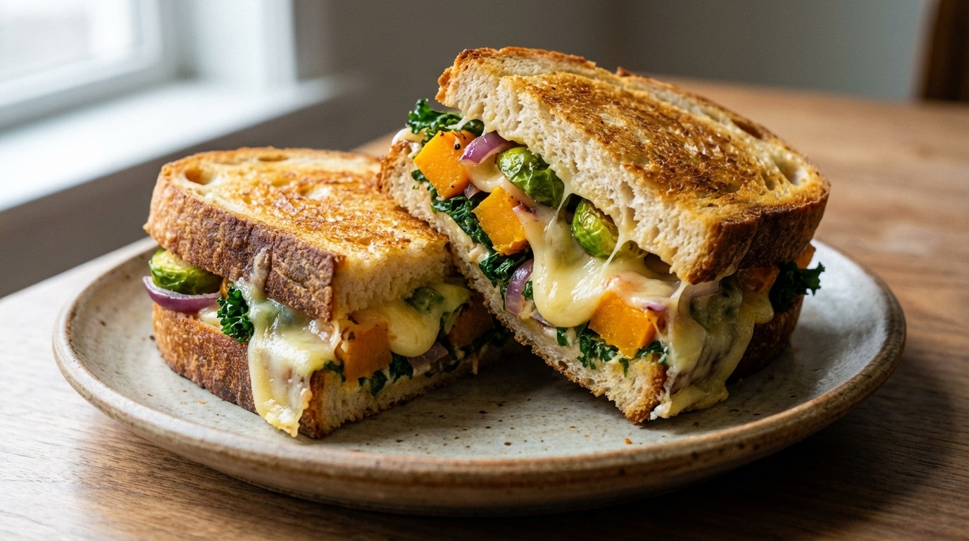 Ce sandwich chaud brille par sa capacité à s’adapter aux richesses du garde-manger hivernal. Une première variante consiste à remplacer la courge par une fondue de poireaux crémeuse, relevée d’un trait de moutarde à l’ancienne et associée à un cheddar affiné. Le poireau, légume roi de janvier, apporte une saveur douce et aillée qui se marie divinement avec le piquant de la moutarde. C’est une excellente façon de transformer un reste de garniture en un repas totalement nouveau, où le fondant du légume contraste avec le pain grillé.
