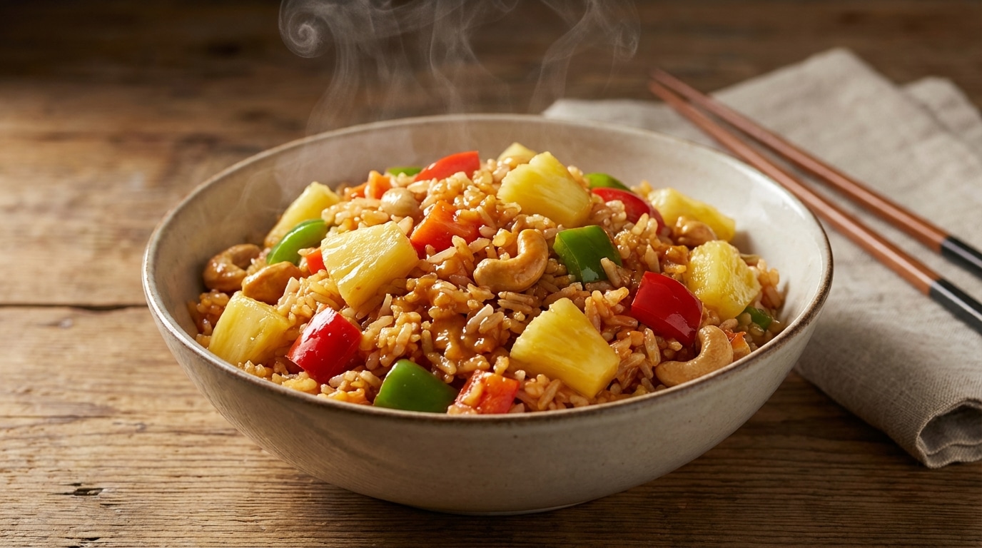 Pour transformer cette recette express en un festin visuel et gustatif, le jeu des textures finales est primordial. Parsemer le plat de noix de cajou torréfiées ou de cacahuètes concassées juste avant de servir apporte une dimension croquante irrésistible. La fraîcheur est amenée par les cives ciselées ou de la coriandre fraîche, qui tranchent avec la chaleur du riz sauté. Un quartier de citron vert pressé au dernier moment réveillera l’ensemble grâce à une acidité bienvenue qui contrebalance le goût sucré de l’ananas.