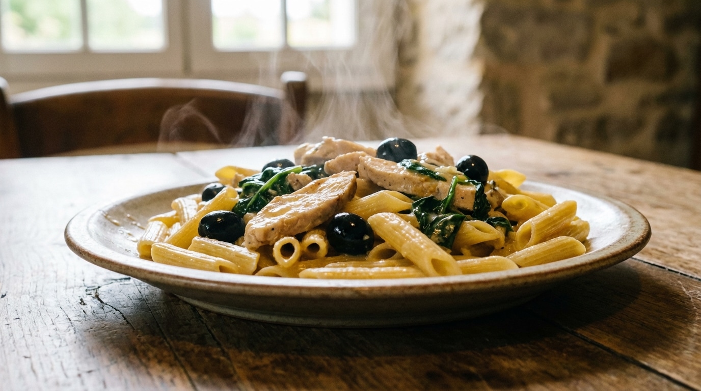 Capture vidéo : Carrefour Belgium6. Ajoutez les épinards et les olives puis mélangez. Coupez les filets de poulet en tranches et dressez les penne.