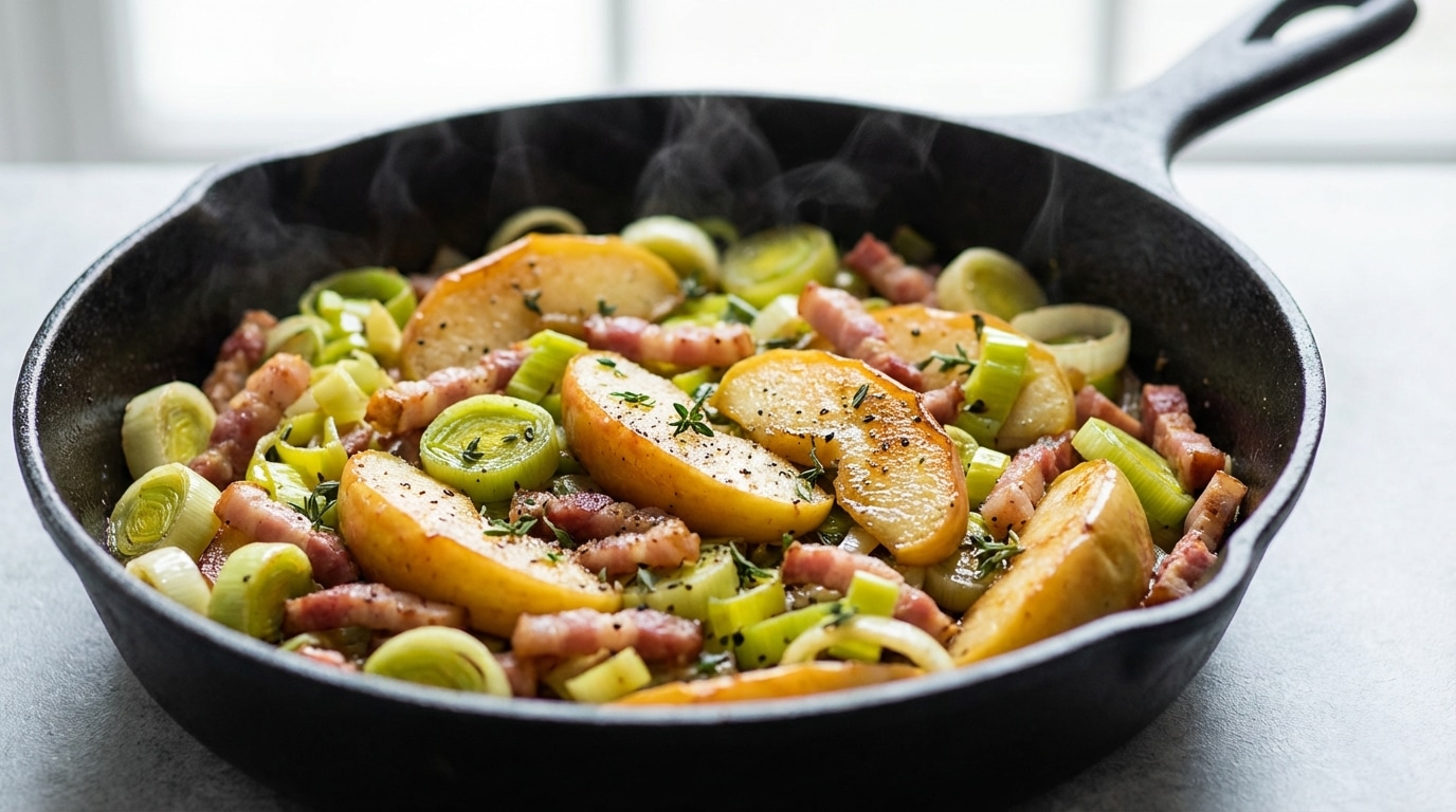 Une fois la charcuterie colorée, l’ajout d’une noix de beurre permet d’accueillir les rondelles de poireaux. Il faut alors les faire revenir à feu moyen en remuant régulièrement jusqu’à ce qu’ils deviennent tendres et translucides. C’est à ce moment précis que l’on incorpore les quartiers de pomme. Le tout doit cuire ensemble quelques minutes supplémentaires pour permettre aux sucres naturels du fruit de caraméliser légèrement les sucs de cuisson. Cette étape est cruciale pour lier les saveurs entres elles.