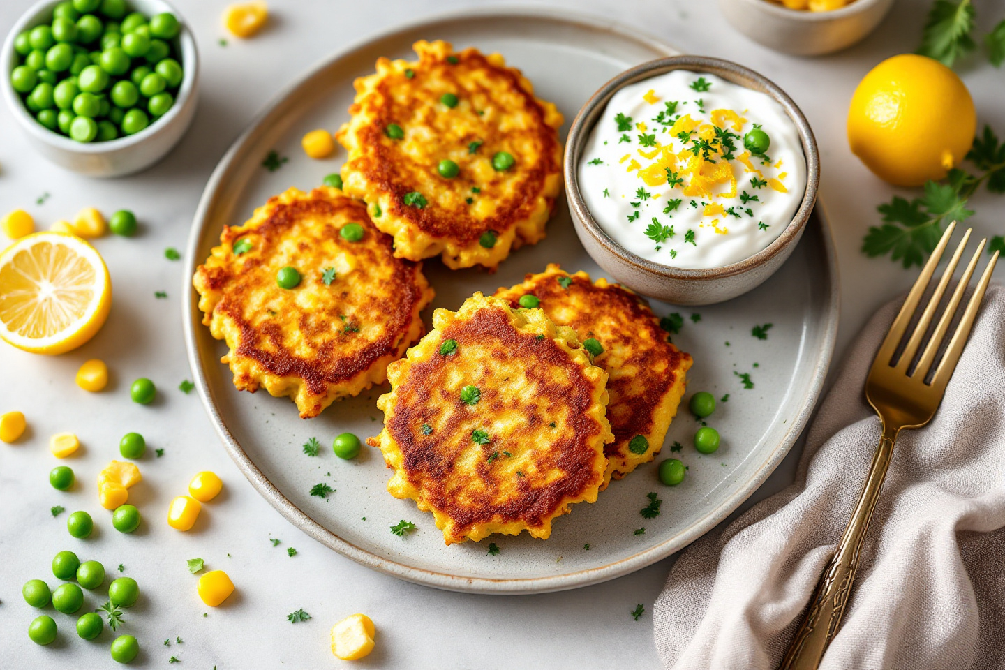 “Je fais ces galettes de maïs et petits pois chaque semaine” : croquantes, prêtes en 20 minutes et irrésistibles avec leur sauce yaourt citronnée