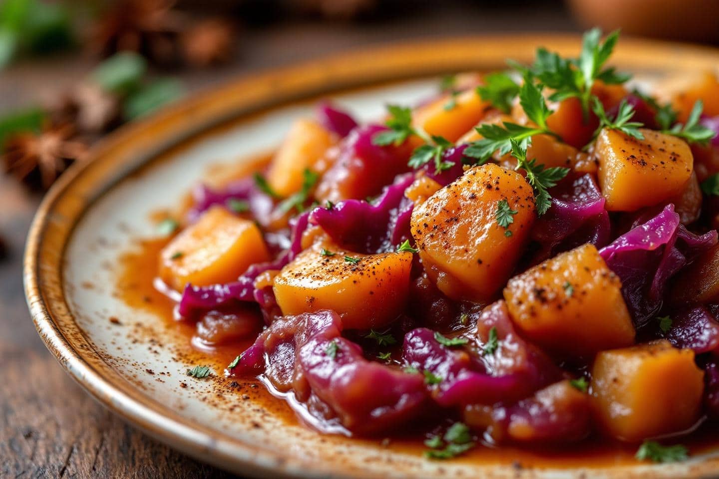 Lorsque la préparation frémit, baisser le feu et couvrir. Laisser mijoter trente à quarante minutes, en remuant de temps en temps. Le plat gagne alors toute sa profondeur : le chou devient tendre, les pommes se fondent quasi à la cuillère et les épices développent une fragrance douce et envoûtante. En fin de cuisson, poivrer généreusement, ajuster l’assaisonnement et retirer les épices entières. Servir bien chaud, immédiatement, ou maintenir au chaud pour plus tard.